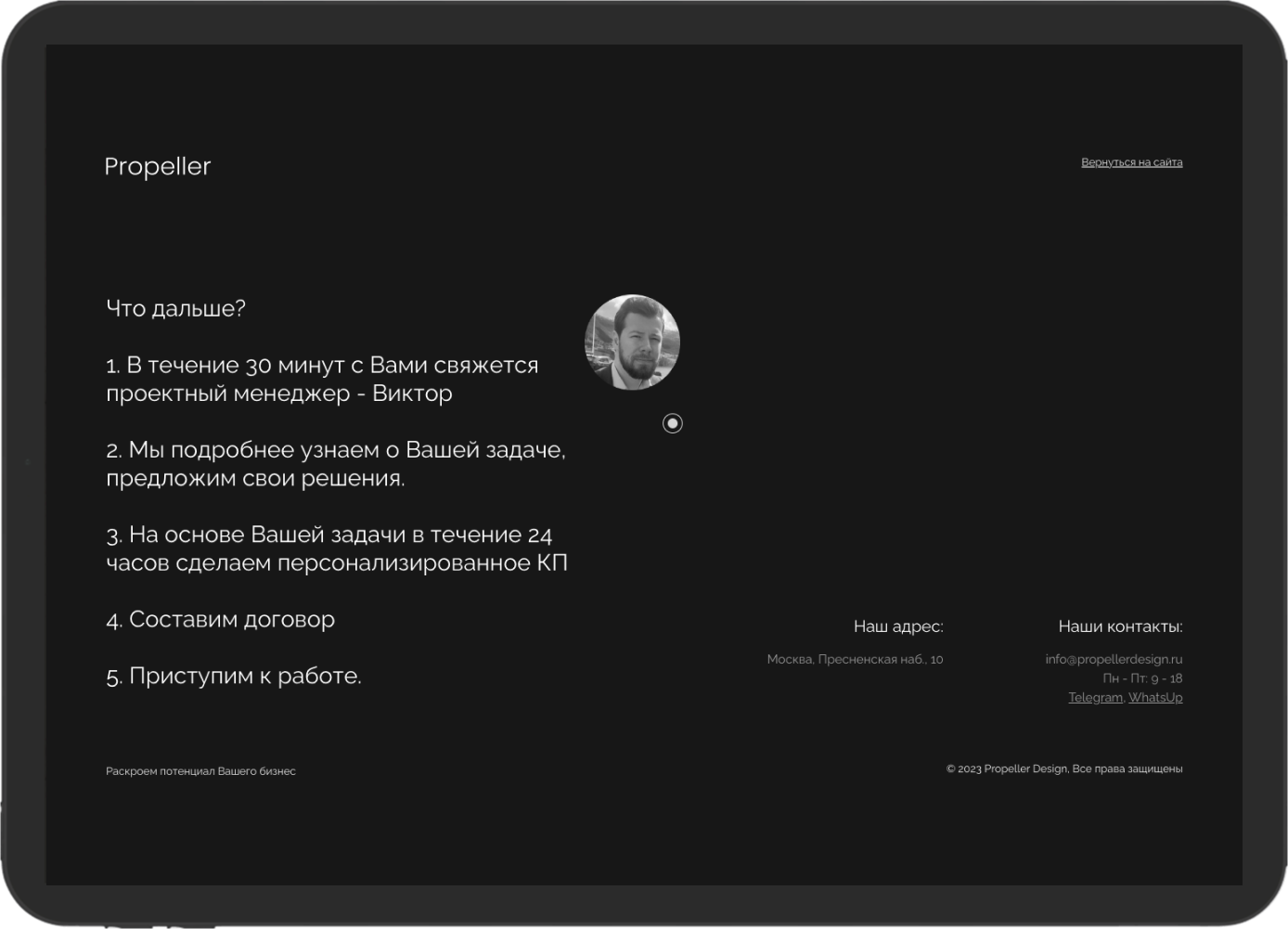 Прием №1. В 99% случаев после отправки заявки получаем сообщение "Спасибо за заявку, мы свяжемся с вами". Но это не информирует пользователя о дальнейшем процессе. Нужно открыть детальную страницу с описанием, кто будет связываться и как происходит взаимодействие. Это другой опыт и ожидания клиента. Простая механика, но иногда недооцененная. Экспериментируйте и смотрите на конверсию.